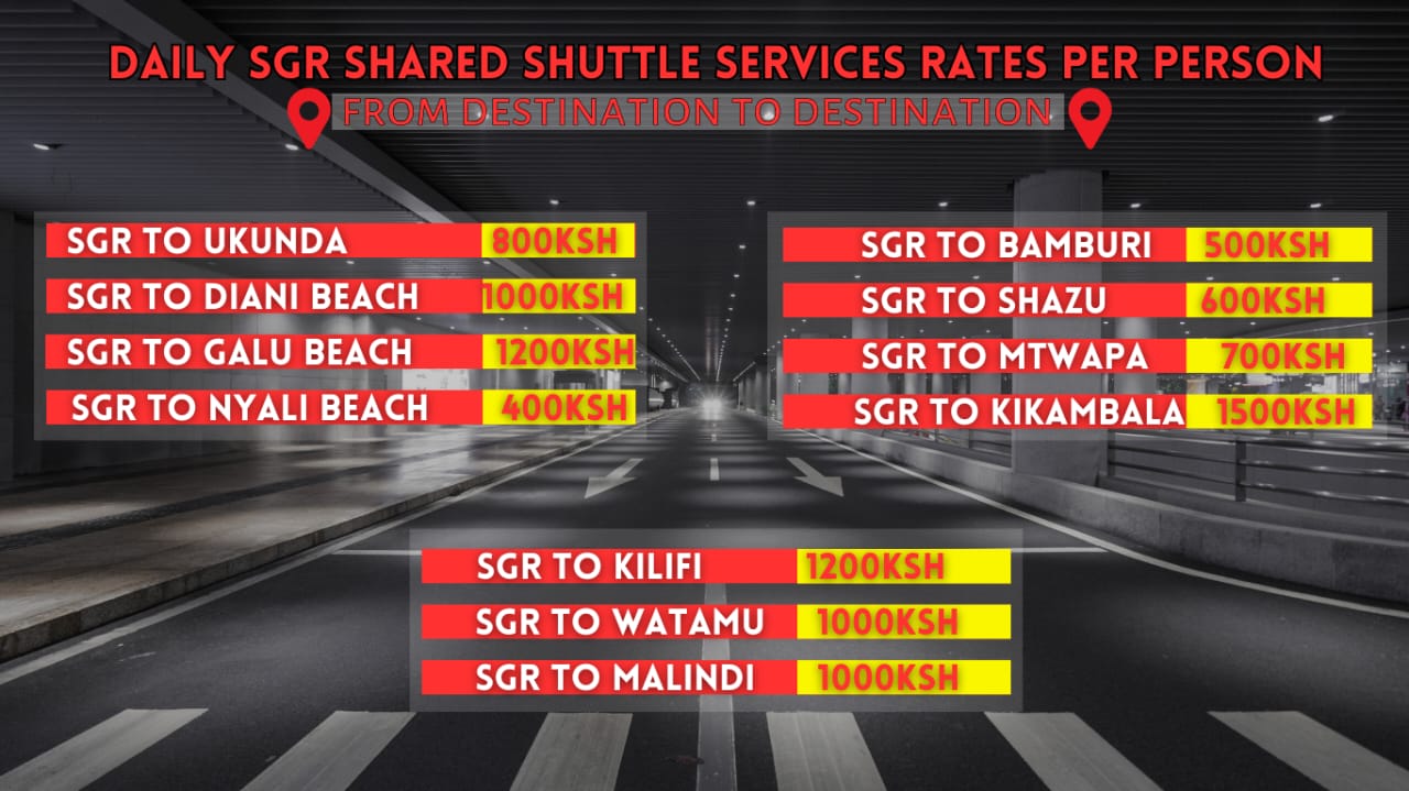 | SGR TO NYALI BEACH | $25 | $30 | $40 |